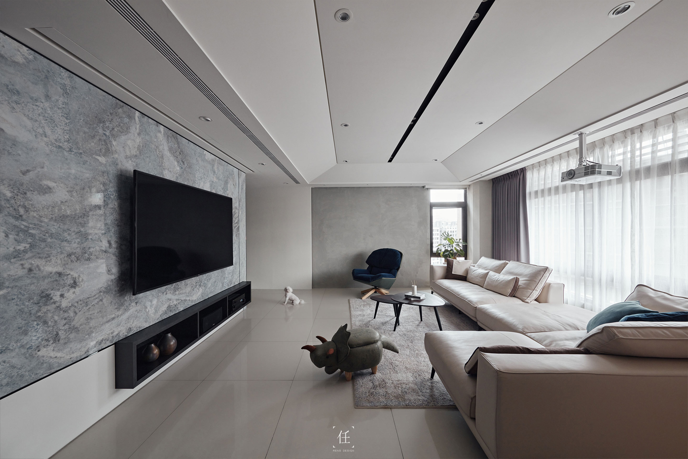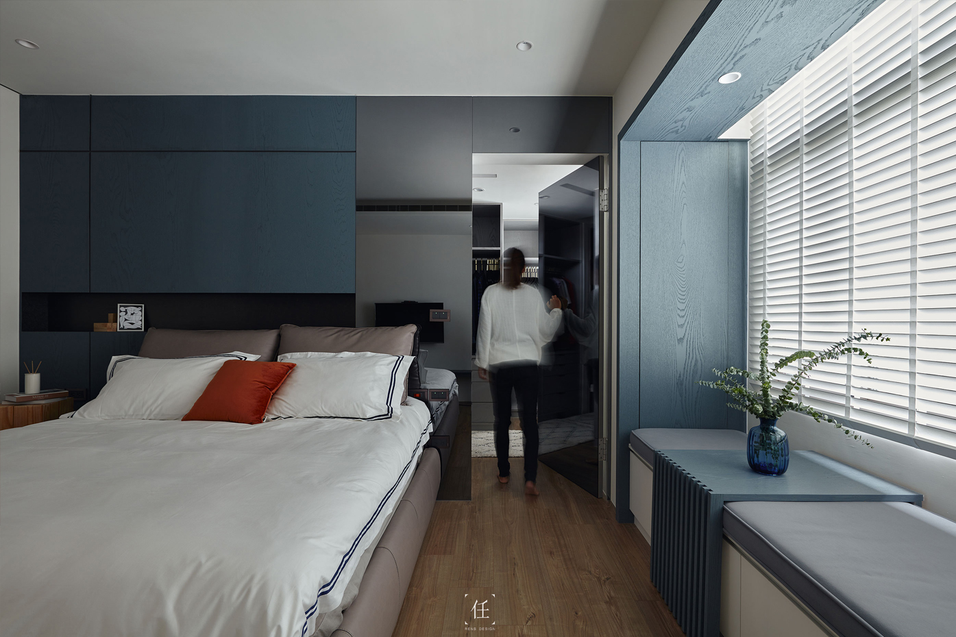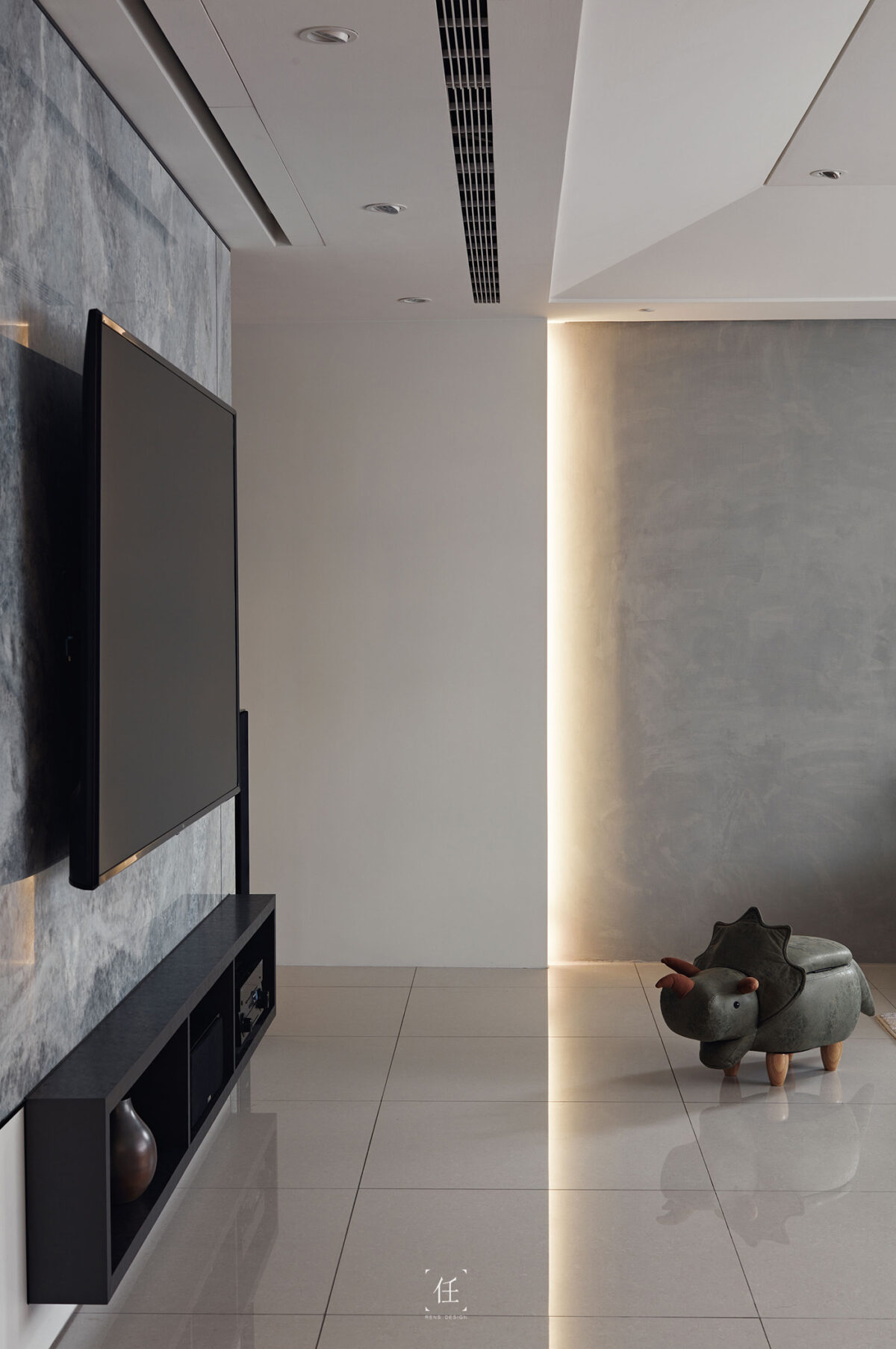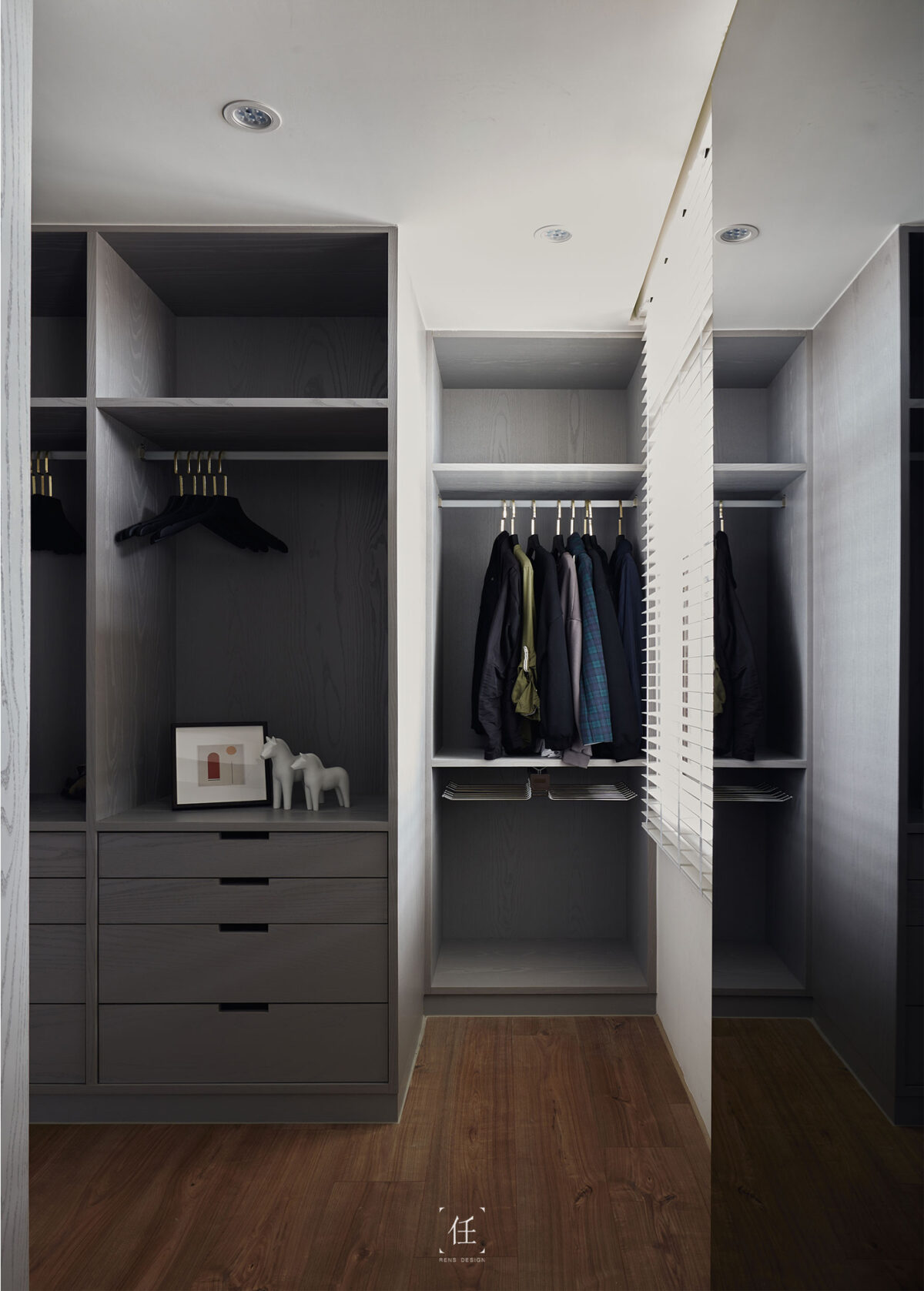 坐落鄰近美術館、前方有清澈溪流,想必是個富人文、安寧,且相當合宜之居住地吧。這是來自科技業的他與國樂手妻子展開中部生活的首選地點。卸下工作帶來的壓力,於如此繁忙之時代,簡約已成為生活的一種主流。回到家就該簡簡單單。空間整體調性白、灰為主,帶入些許溫暖木質。俐落的石材電視牆將玄關與客廳巧妙區隔,呈現迴字形使行走動線高流暢度,同時具備實用收納機能,以簡單的量體規劃取代過度裝飾。標準的LDK配置加上開放式廚房設計,在通過玄關後將室內盡收眼底。進入主臥映入眼簾則是冷靜沉穩的藍,與主人們的個性相互輝映,而藏在落地鏡門的身後,是排列整齊且一覽無疑的更衣空間。
