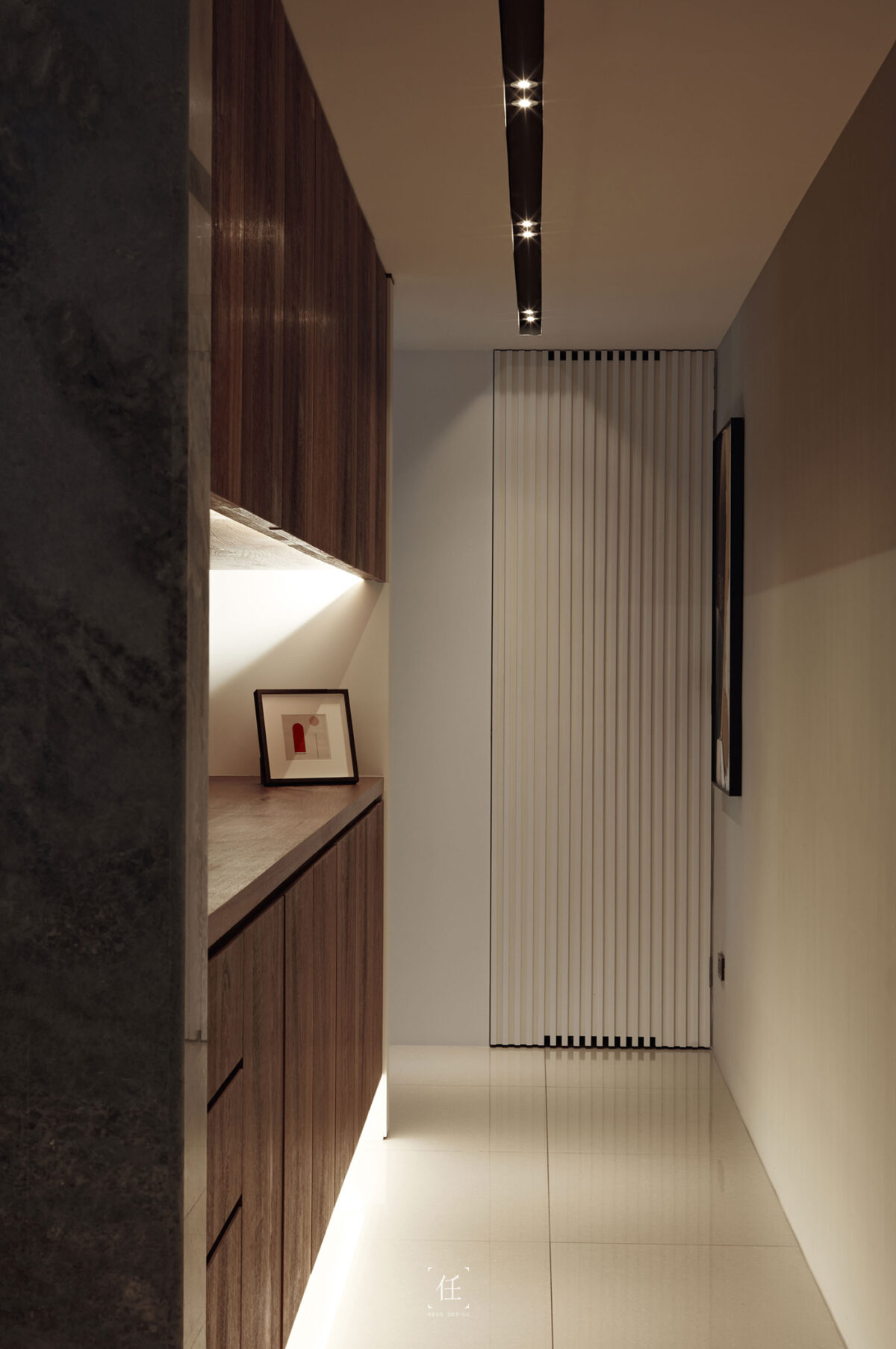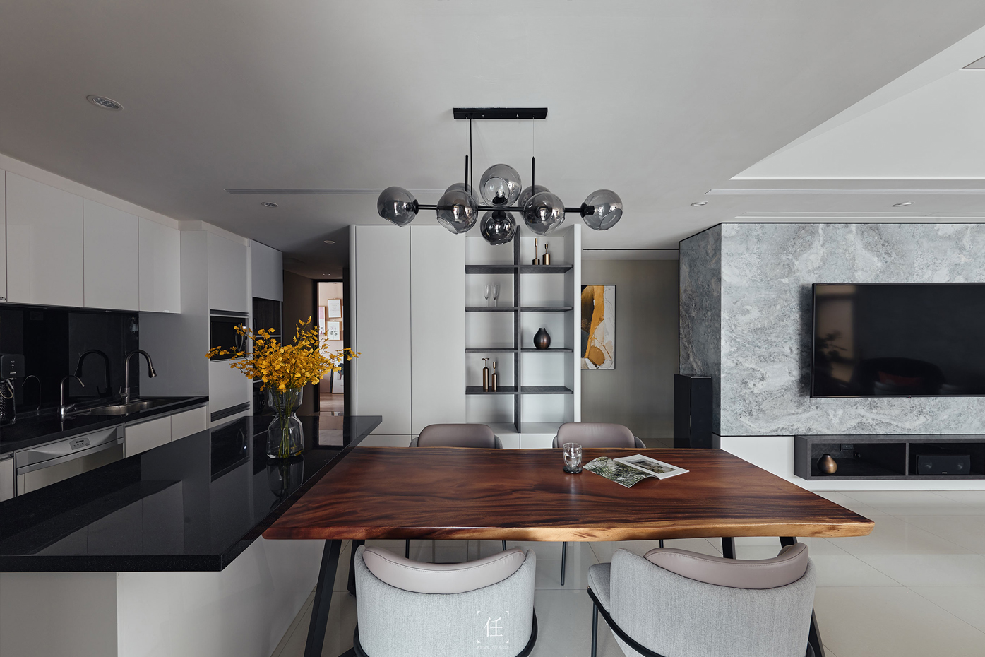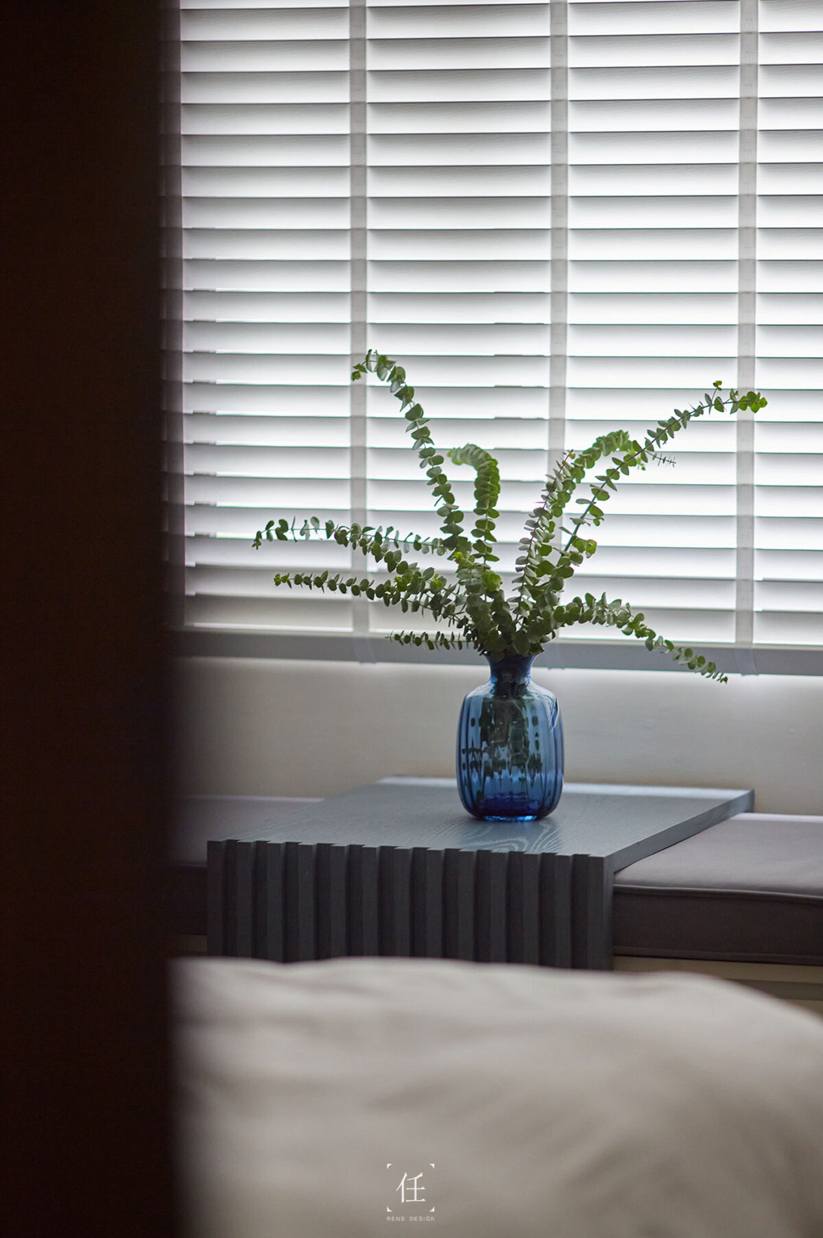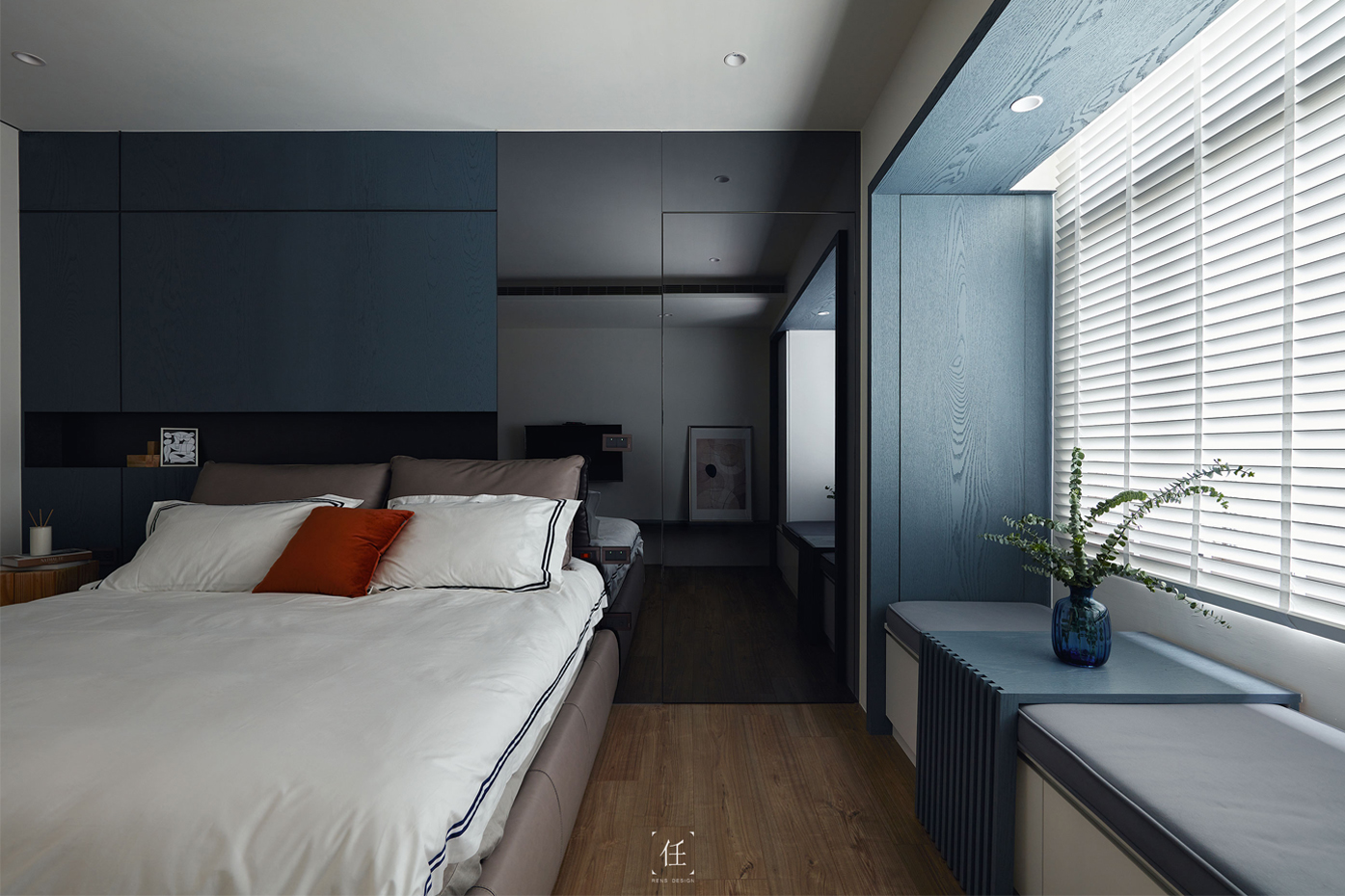 坐落鄰近美術館、前方有清澈溪流,想必是個富人文、安寧,且相當合宜之居住地吧。這是來自科技業的他與國樂手妻子展開中部生活的首選地點。卸下工作帶來的壓力,於如此繁忙之時代,簡約已成為生活的一種主流。回到家就該簡簡單單。空間整體調性白、灰為主,帶入些許溫暖木質。俐落的石材電視牆將玄關與客廳巧妙區隔,呈現迴字形使行走動線高流暢度,同時具備實用收納機能,以簡單的量體規劃取代過度裝飾。標準的LDK配置加上開放式廚房設計,在通過玄關後將室內盡收眼底。進入主臥映入眼簾則是冷靜沉穩的藍,與主人們的個性相互輝映,而藏在落地鏡門的身後,是排列整齊且一覽無疑的更衣空間。