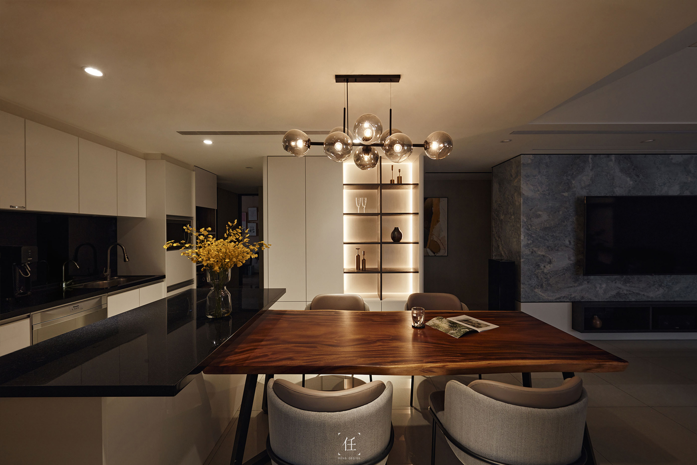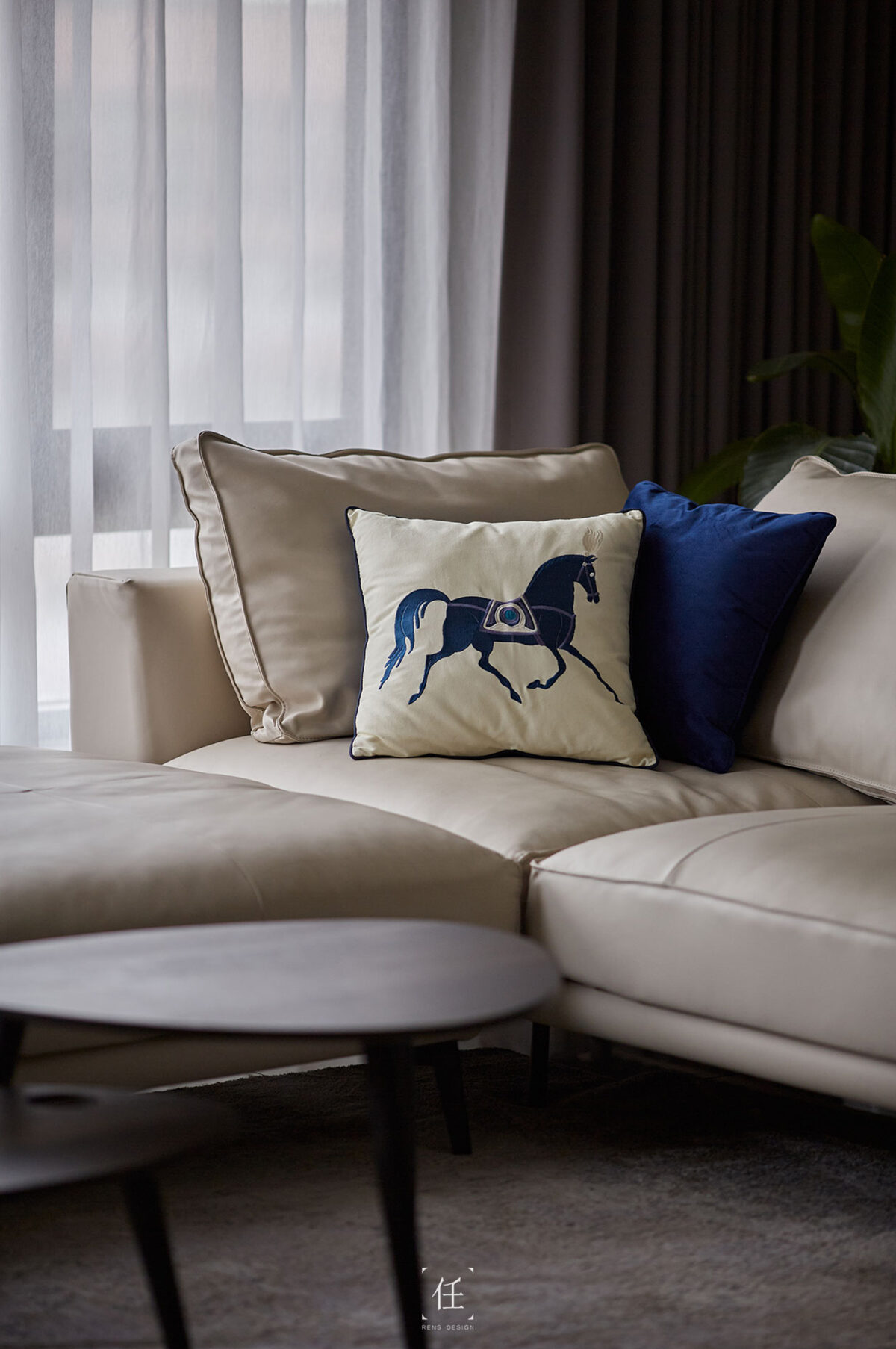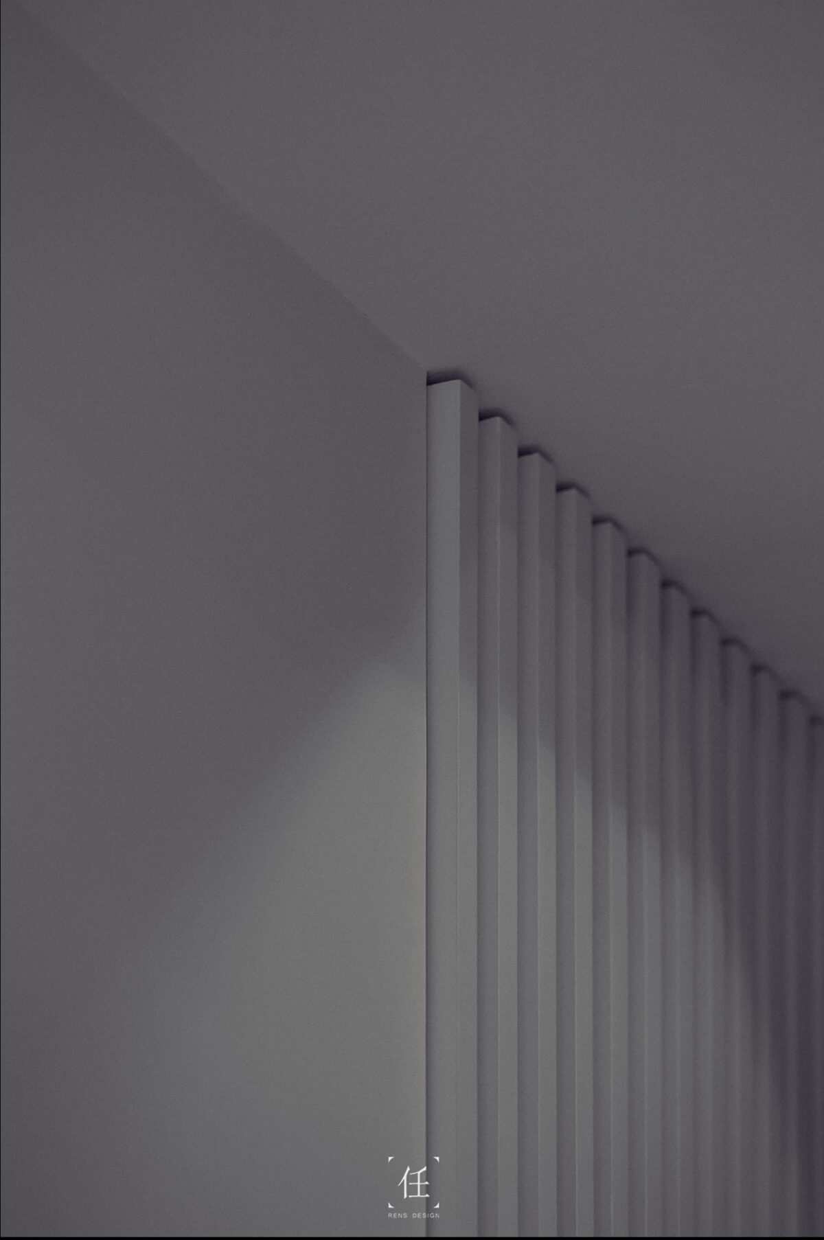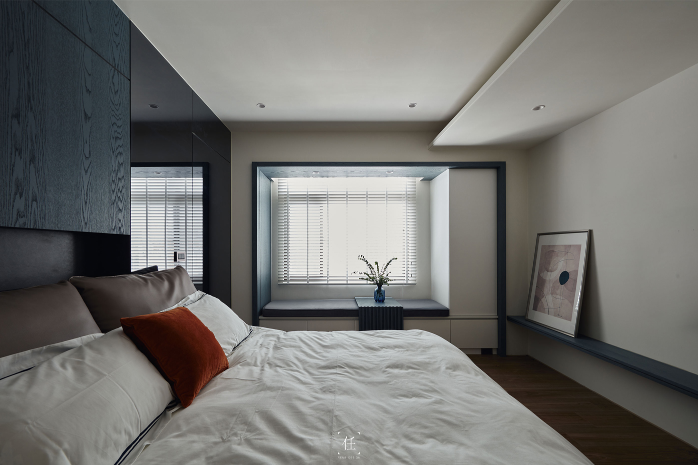 坐落鄰近美術館、前方有清澈溪流,想必是個富人文、安寧,且相當合宜之居住地吧。這是來自科技業的他與國樂手妻子展開中部生活的首選地點。卸下工作帶來的壓力,於如此繁忙之時代,簡約已成為生活的一種主流。回到家就該簡簡單單。空間整體調性白、灰為主,帶入些許溫暖木質。俐落的石材電視牆將玄關與客廳巧妙區隔,呈現迴字形使行走動線高流暢度,同時具備實用收納機能,以簡單的量體規劃取代過度裝飾。標準的LDK配置加上開放式廚房設計,在通過玄關後將室內盡收眼底。進入主臥映入眼簾則是冷靜沉穩的藍,與主人們的個性相互輝映,而藏在落地鏡門的身後,是排列整齊且一覽無疑的更衣空間。