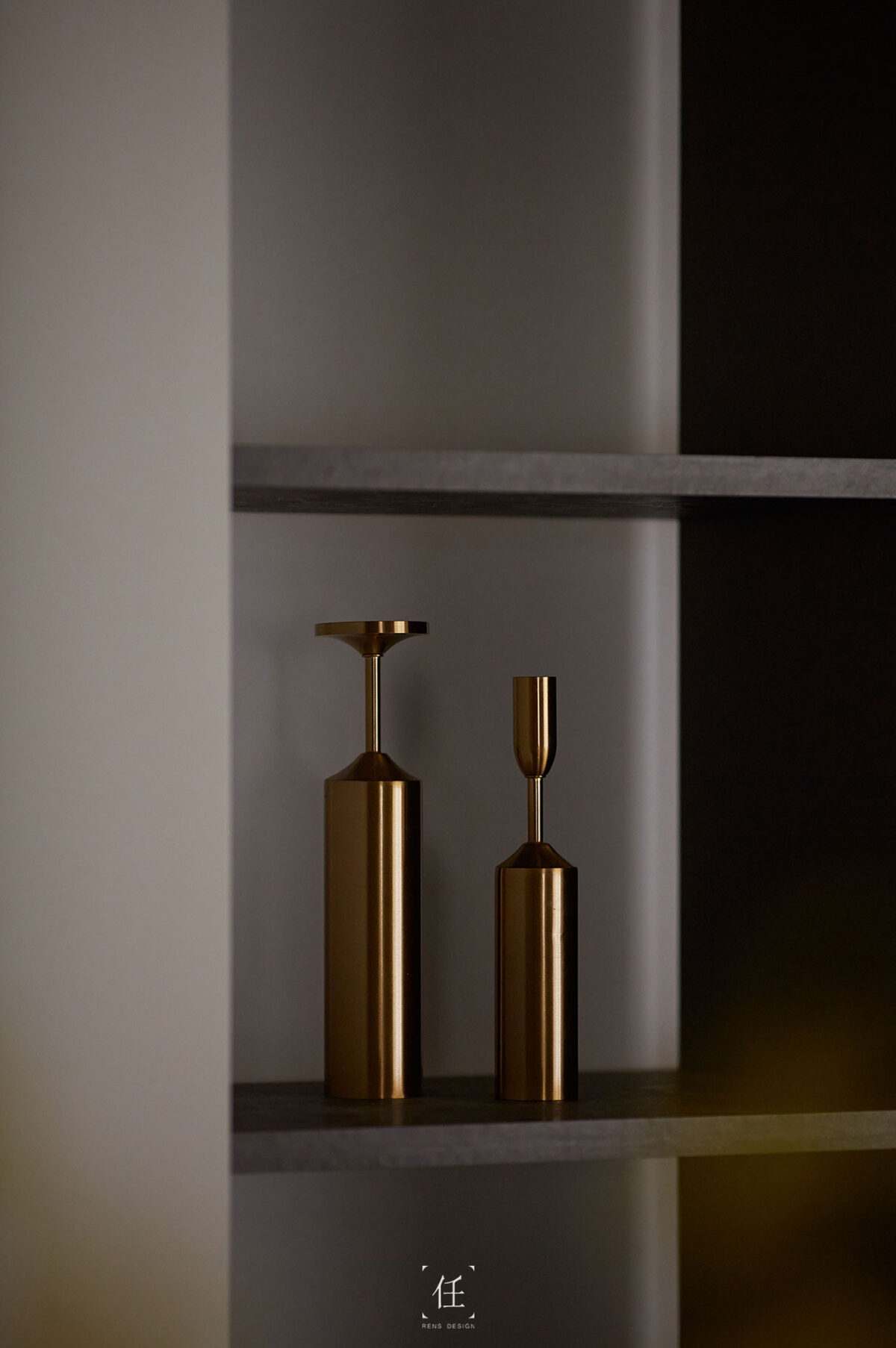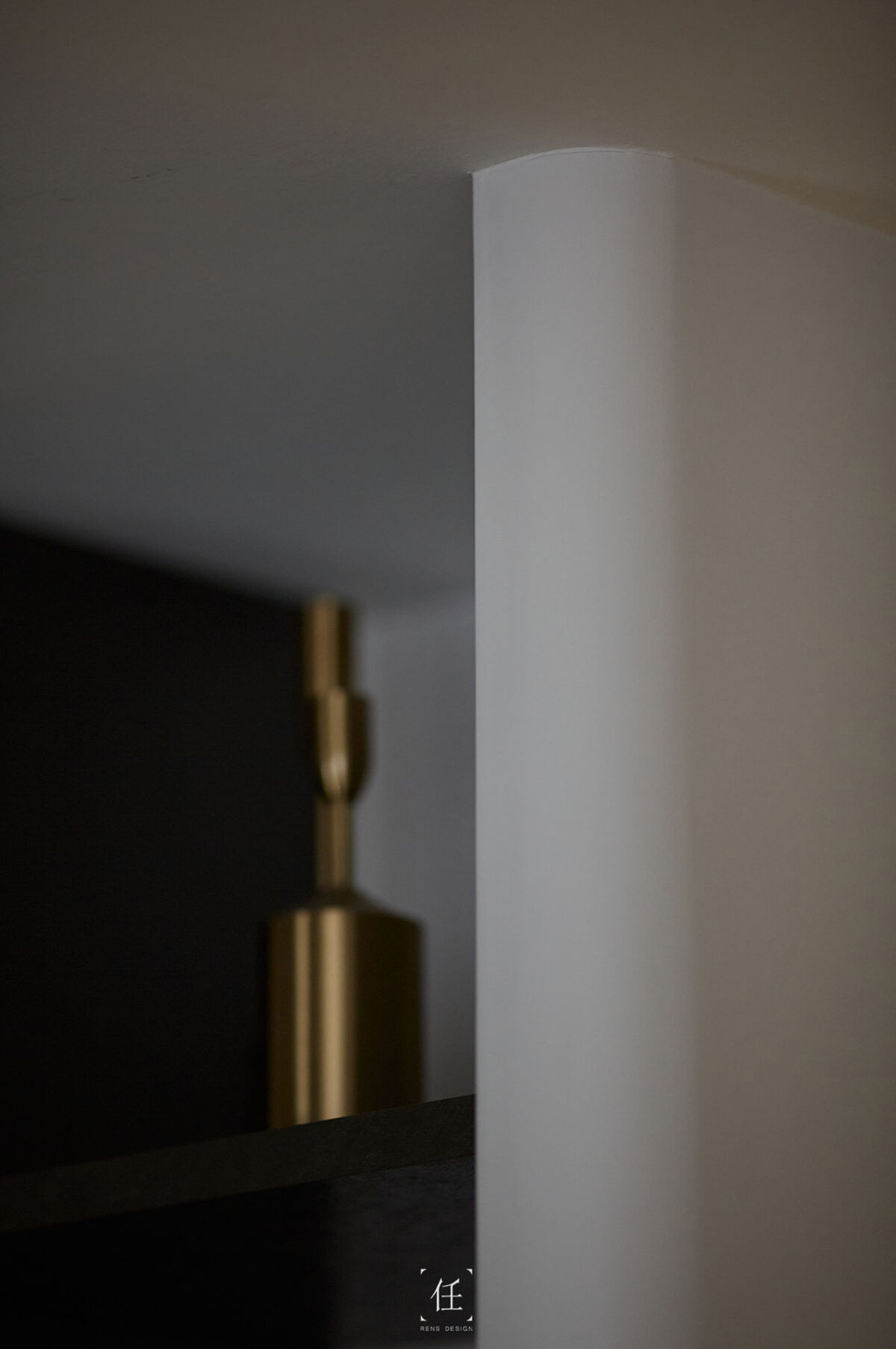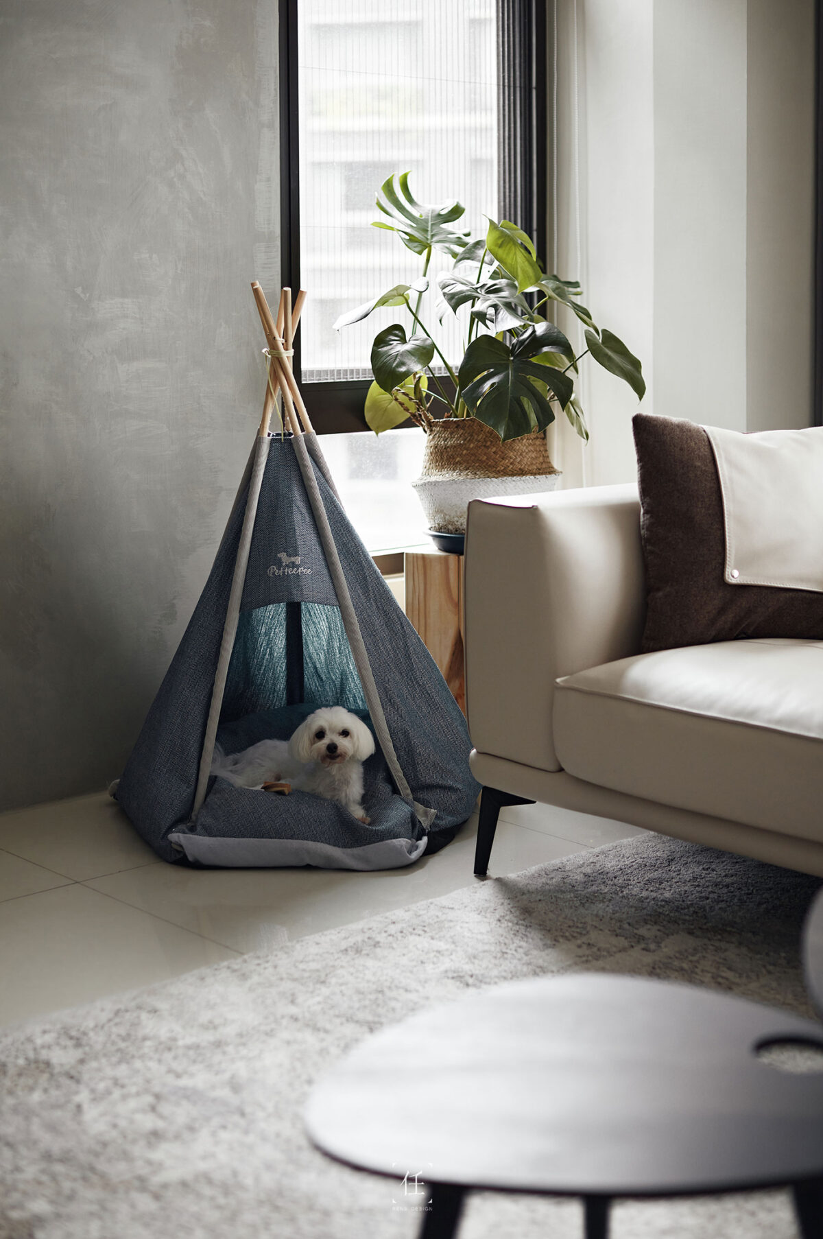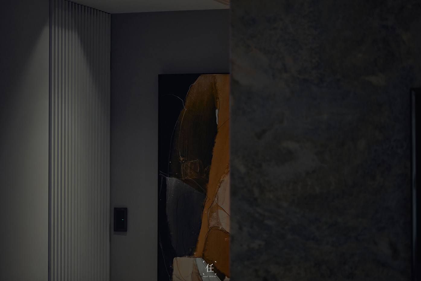 坐落鄰近美術館、前方有清澈溪流,想必是個富人文、安寧,且相當合宜之居住地吧。這是來自科技業的他與國樂手妻子展開中部生活的首選地點。卸下工作帶來的壓力,於如此繁忙之時代,簡約已成為生活的一種主流。回到家就該簡簡單單。空間整體調性白、灰為主,帶入些許溫暖木質。俐落的石材電視牆將玄關與客廳巧妙區隔,呈現迴字形使行走動線高流暢度,同時具備實用收納機能,以簡單的量體規劃取代過度裝飾。標準的LDK配置加上開放式廚房設計,在通過玄關後將室內盡收眼底。進入主臥映入眼簾則是冷靜沉穩的藍,與主人們的個性相互輝映,而藏在落地鏡門的身後,是排列整齊且一覽無疑的更衣空間。